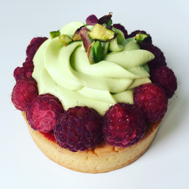 Тарталетка. Запеченый фисташковый крем, кули малины и взбитый фисташковый ганаш
