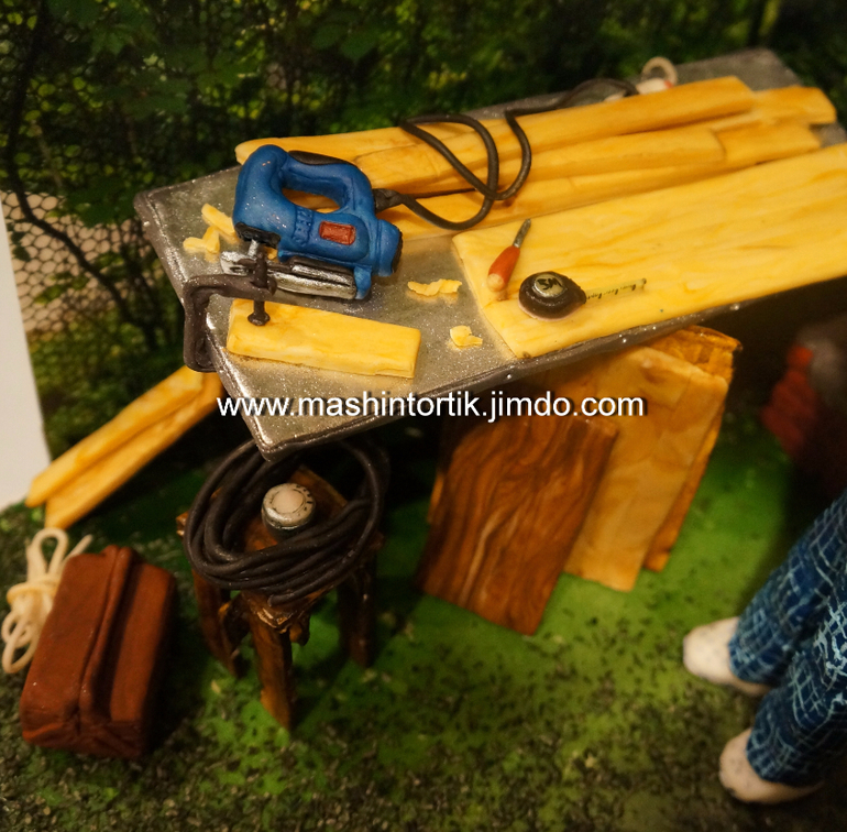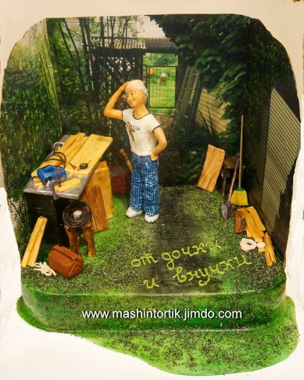 Торты для мужчинТорт на юбилей для любимого папы заказчицы. Папа в этом чудесном уголке дачном (фото реальные) на своем верстаке очень любит мастерить нужности для дома. инструменты, место, одежда - все сделано по фото, как и сам папа :) Вес 4,8 кг, кофейный бисквит, шоколадно-кофейный мусс, кофейная же пропитка. Леночке, как всегда, спасибо за печать. стеночки - тонкая желатинка