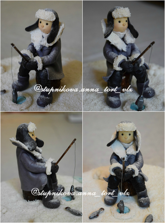 Забавный заказ летом)) но мужчина любит зимнюю рыбалку. Поэтому жару разбавил "холодный" тортик)) Рыбак под катом