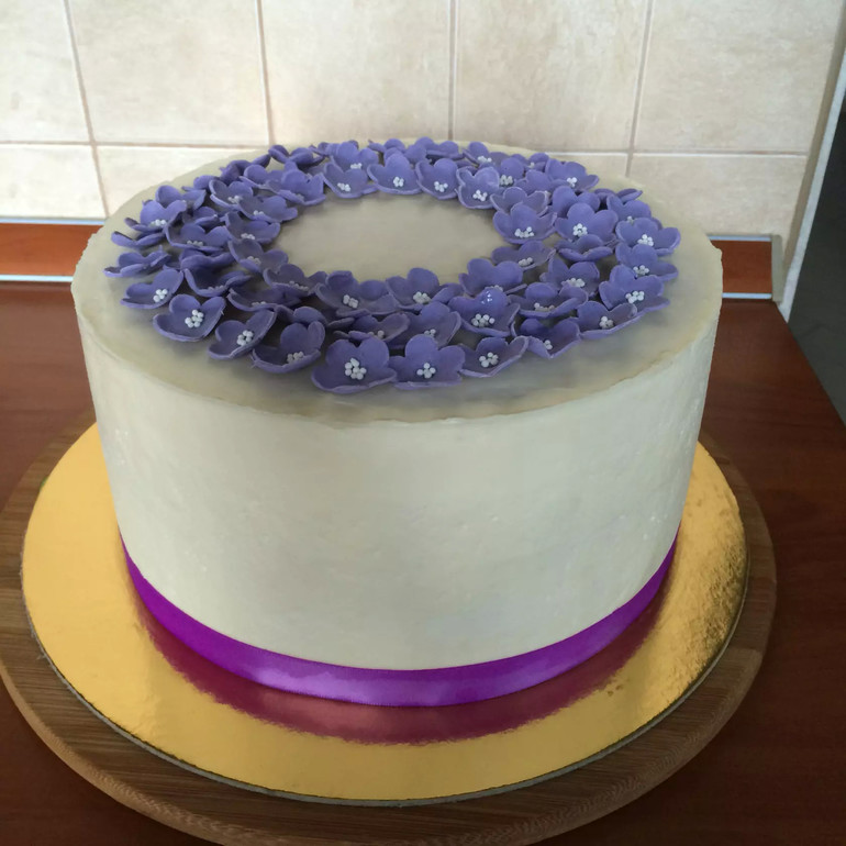 Украшала я его очень быстро. Первоначальная задумка была украсить голубикой, но не успела купить, гости на пороге, а у меня голый торт в холодильнике стоит. Ну вот и родилось такое вот цветочное.