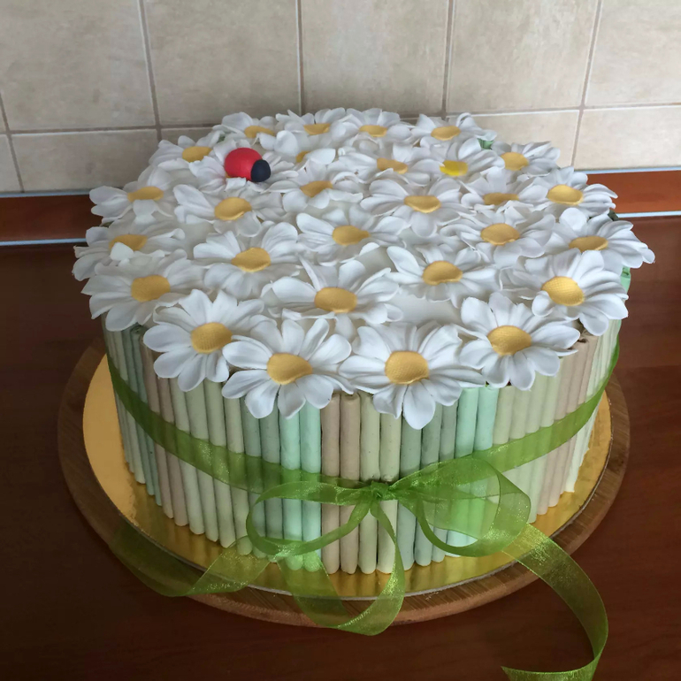 Девочки, мастерицы мастичных тортов, вы героини! Это же сколько времени требуется на торт!? Я с этими трубочками просто замучилась. А начиналось все совсем по другому. Торт я себе совсем другой представляла в голове, но моя сестренка любит ну уж очень, очень мокрый торт чтобы прям жевать не нужно. Ну я и постаралась, пропитала на славу. После того как он отстоялся, раскрыв его я поняла, то что его нужно срочно очень хорошо укрепить иначе он просто расползется, а мне его еще везти 60 км. Ну и появился известный всем ромашковый букет.