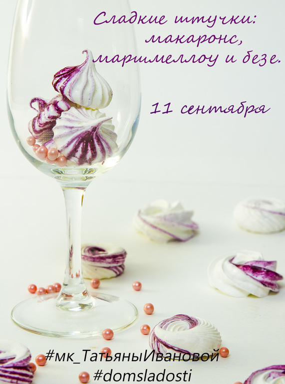 11 сентября в школе "Сладость" состоится практический мастер-класс "Сладкие штучки: маршмеллоу, безе с мармеладом, безе на палочке, макарон".