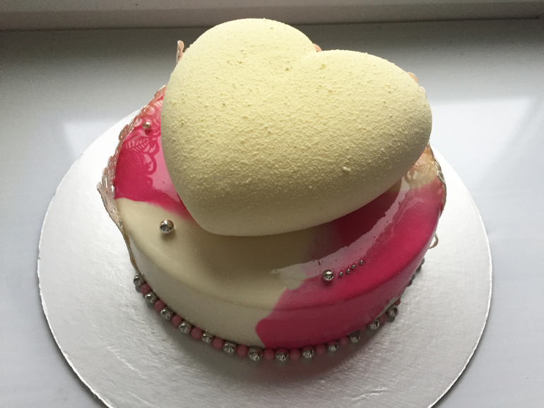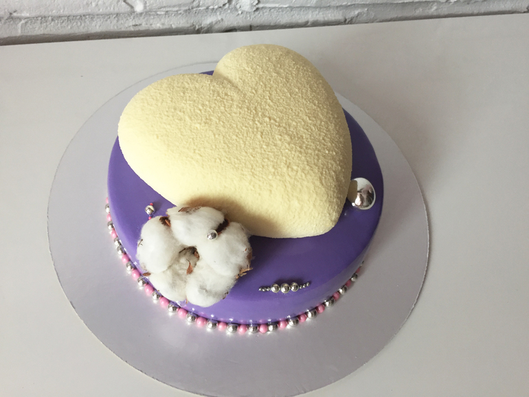 Таких тортов у меня было ровно 4. Сердце лежит просто сверху на глазури без шпажки. Никогда в процессе перевозки не уезжало , вчера вот два часа ехали , всё хорошо было, только водичка образовалась( Да , веточка хлопка , изолированная пищевой плёнкой и потом шоколадом