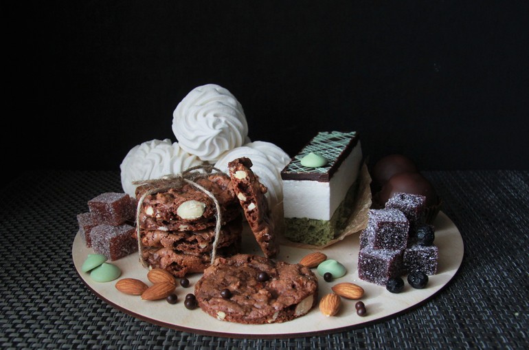 Очередной раз заказали набор на пробу. Просто не знали что выбрать к чаю) В данный входит: яблочный зефир, мармелад клубничный и яблоко-черноплодная рябина, кофейно-шоколадное печенье с миндалем, кейкпопсы с легкой апельсиновой ноткой, и легкое зефирное пирожное с бисквитом на чае матча и глазурью из горького шоколада. На мой взгляд - прекрасная альтернатива сладкому и жирному «Птичьему молоку»!