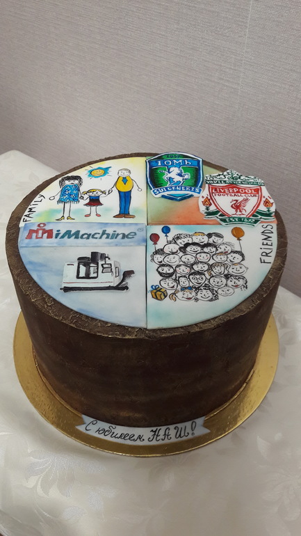 Торты для мужчинТема торта сначала показалась мне очень нетортовой и слишком загруженной, потом что-то в голове сложилось и вот что вышло из пожеланий " картинка из 4-х частей семья, работа (фрезерные станки мне еще не доводилось рисовать :) , друзья и хобби (футбол - эмблемы двух любимых команд) и ооочень длинная надпись, которую я попросила укоротить, жена юбиляра решила укоротить ее именно так))) хозяин-барин. В итоге все остались довольны, но сказали "было вкусно, но мало", в декабре ждут еще)