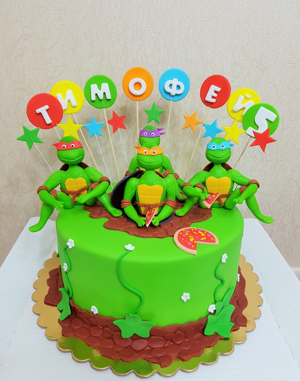 Торт очень симпатичный! Рафаэля и Леонардо надо было посадить не фронтально, а в профиль, тогда более гармонично было бы. Ноги не повисли бы. Так надо понимать фигурки высохли и положение ног изменить нельзя было. У меня тоже такие казусы бывают.