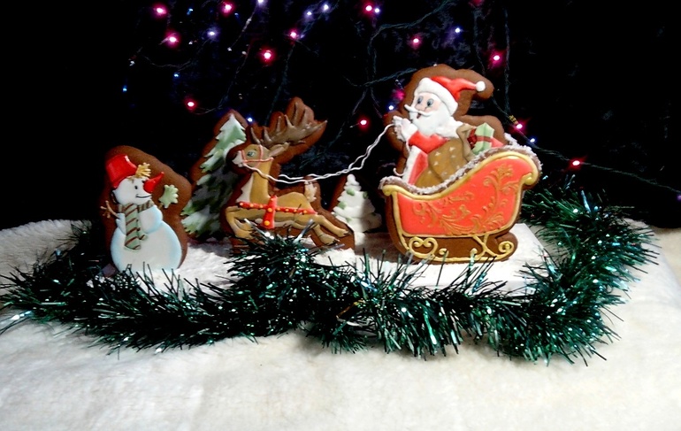 Вот такой Дед в личной колеснице)) В общем, сделала пряники, сделала фото, скинула на ком...и что-то мне как-то не то. Потом поняла - мне нужна ночь! В смысле, волшебство то обычно ночью происходит! Сделала второе фото типа ночью. Ну, не скажу, что прям такая ночь-ночь, но что-то типа звёздочек на почти чёрном небе имею