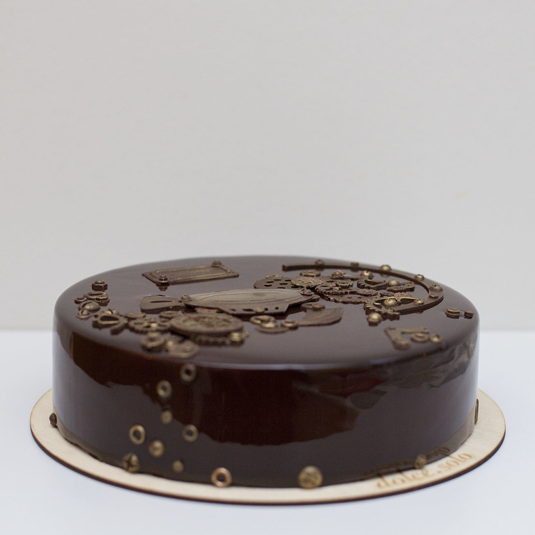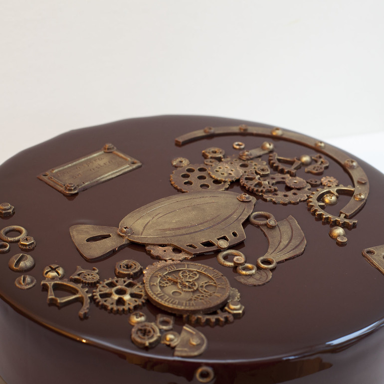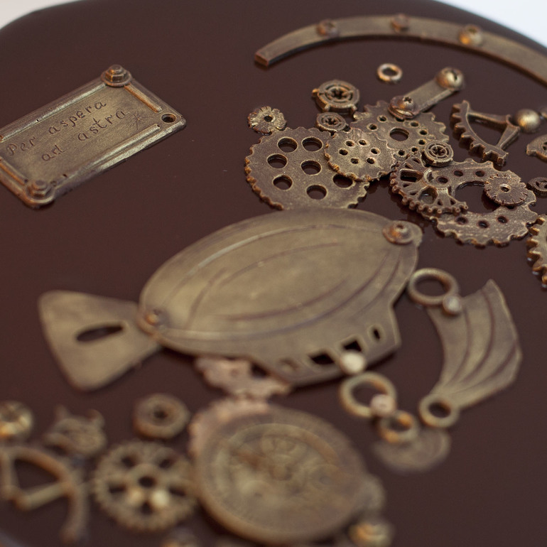 Да он не такой трудоемкий. Винтики и табличка отлиты в формах. С шестеренками фокус не получился, они очень мелко детализированы и тонкие, а формы силиконовые, поэтому шоколад ломался. Пришлось часть делать вручную, ну и дирижабль вырезала. А кандурин действительно волшебно лег на шоколад, как есть металл вышел.