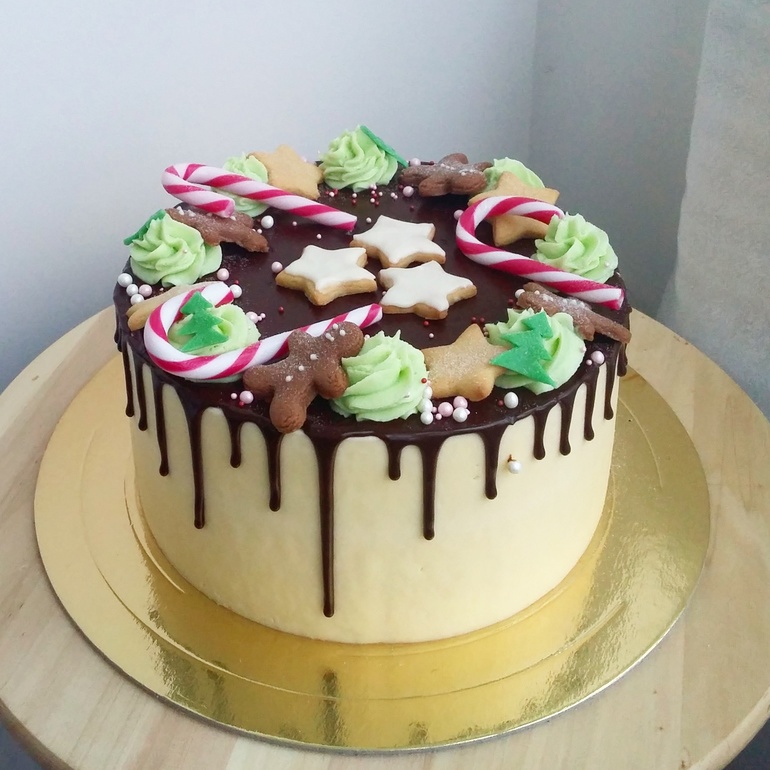 Заказала сотрудница с работы мужа, требований к декору никаких не было, просто вкусный тортик для домашнего чаепития. Но я решила, что тортик обязан просто быть новогодним!