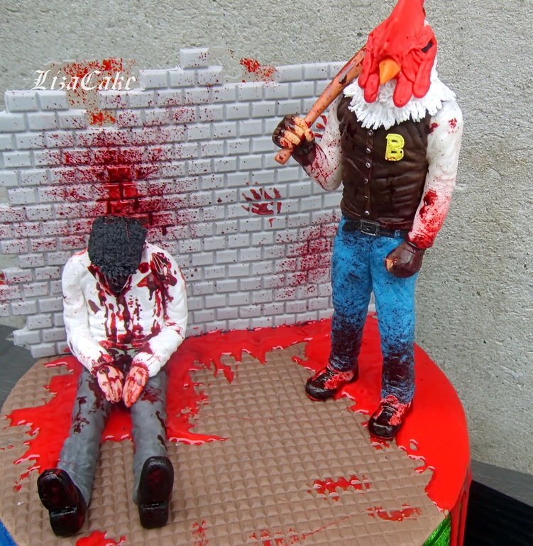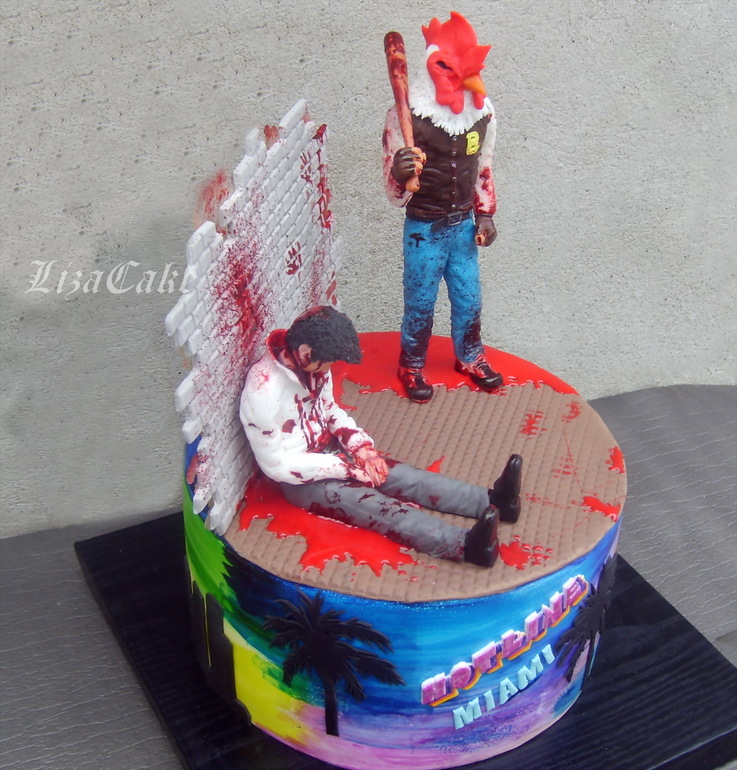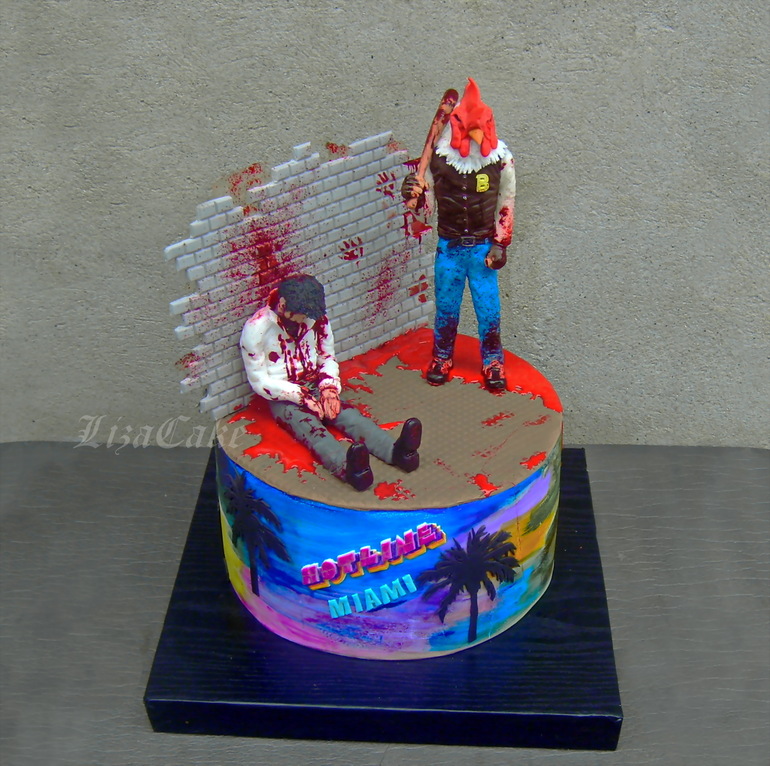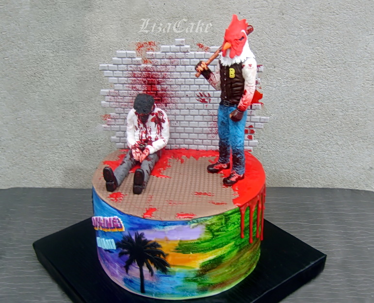 Итак.. торт по игре Hotline Miami.. Игрушка кровавая, поэтому на заглавном фото только психоделичный борт в цветовой гамме игры