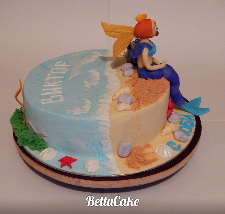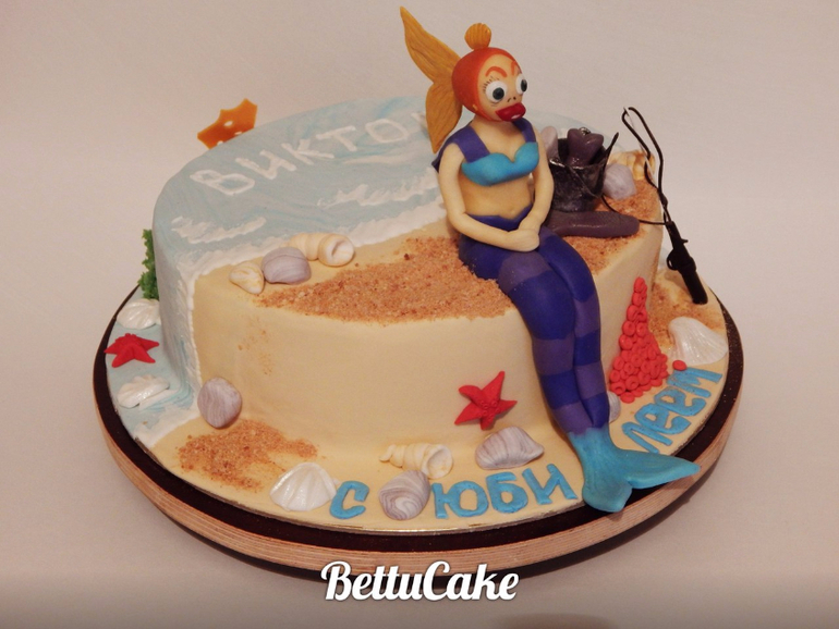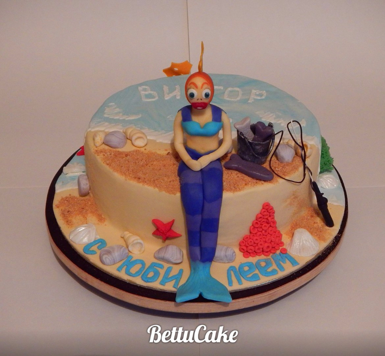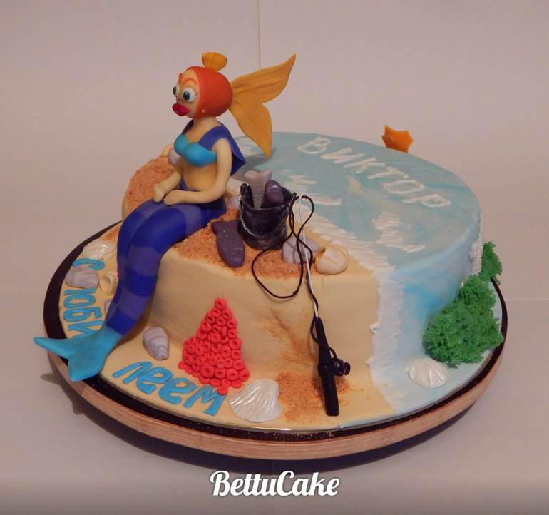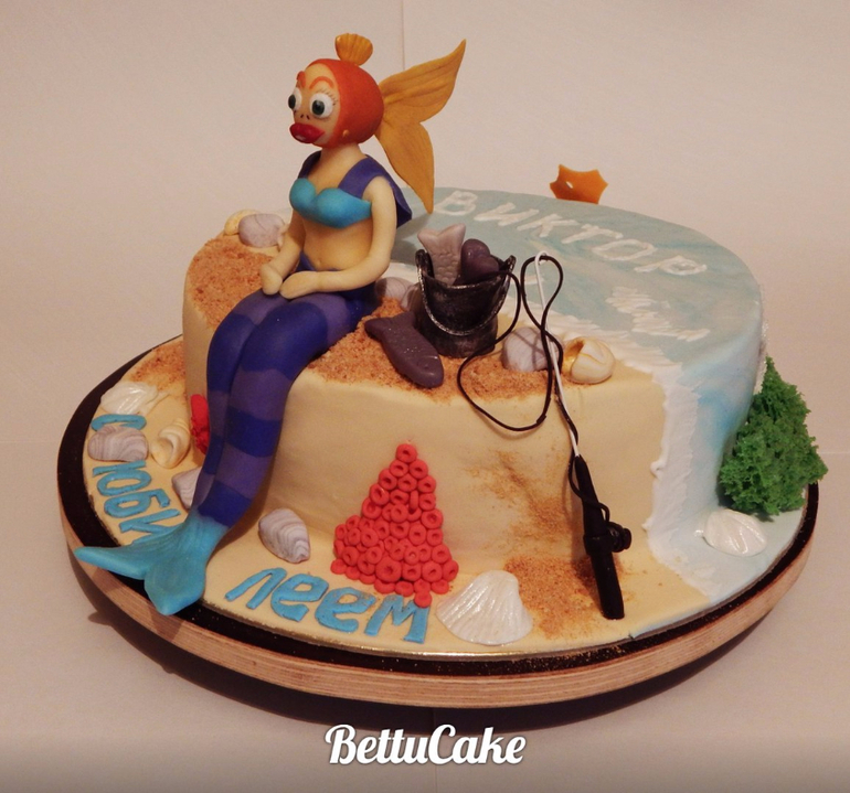 Торты юбилейныеНу вот и я дошла до своего тортика,с дочерью царя из любимого мультика.Не судите строго,косяков много.но я люблю ее.По просьбе заказчика нужно было совместить русалку и рыбалку.Сделала как смогла,по моему получилось.Когда увидела в профиль что лицо плоское.было уже поздно.И уже перед установкой красотки на торт,отлетели ушки.Под кат много фото,не могла выбрать.Юбиляру понравилось.
