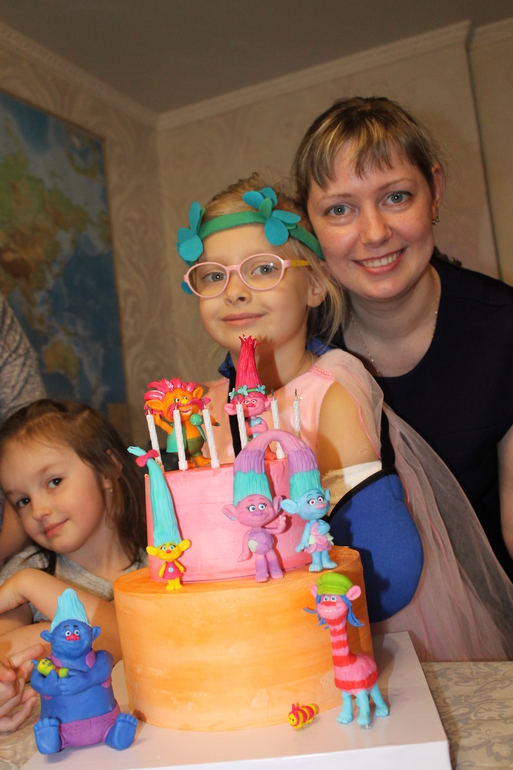ну а сам торт делался очень быстро, просто обмазала кремом, поставила ярусы перед приходим гостей а фигурки во время выноса торта, потому что в день Рождения, гуляя по территории океанариума в Крокусе, моя именинница упала с высокой лавочки прямо на руку и уже вся последующая экскурсия была не в радость и мы уехали домой, где я заметила что с рукой что-то не так. Мы собрались и махнули в Тушинскую больницу в травмпункт, итого перелом руки, возможно со смещением, все праздник отменяется... Пока сделали снимок, невооруженным взглядом виден перелом, потом муки ребенка по вправлению руки (то ли редукция, то ли репозиция, не помню как называется это ) наложение гипса, потом ещё снимок, потом врач посмотрел на снимок и отпустил, но велел вернуться на след день утром и 19-го на контрольный рентген , вообщем ночью вернулись домой, делать нормально торт у меня не было сил, кое-как обмазала кремом выпивая почти целую бутылку шампанского в качестве успокоительного и плюхнулась спать... Утром готовка уборка, все-таки решили отмечать, поездка в больницу для контроля руки, потом докупить что осталось, поиски бандажа для поддержки руки и домой готовить, готовить, готовить... ну и вот такой кривоватый тортик вышел в итоге