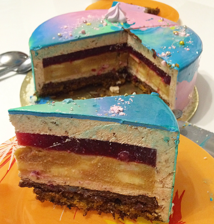 Морковный бисквит , хрустящий слой с фундучным пралине и вафлей, мусс на ряженке с молочным шоколадом , бананы в карамели и клюквенное компоте. Оказалось, что все компонента так подходят друг к другу , что хочет повторить этот торт .