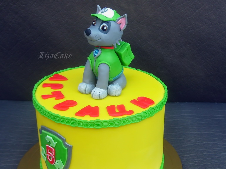 Торты детскиеНезамысловатый торт с любимым щенком Рокки из м/ф "Щенячий патруль" для мальчика на ДР.. Торт без особого изыска - родители немного опоздали с заказом. Впрочем, ничего сложного они и не хотели, основная просьба была щенок Рокки и имя ребенка.