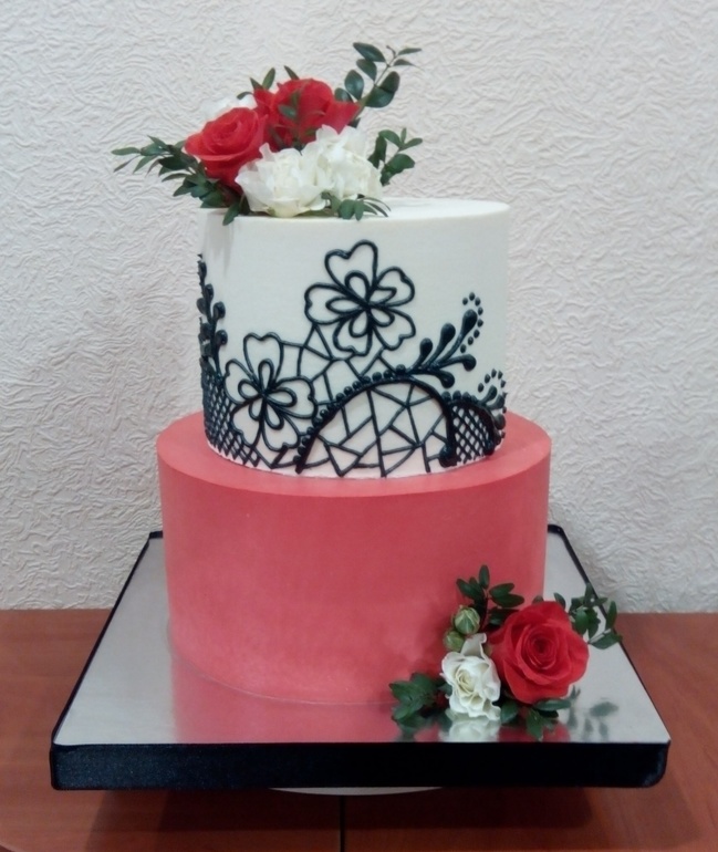 Спасибо большущее!!! На свадебном мастичный топпер. В верхнем ярусе шокобисквит+сливочно-сметанный крем+тофи; в нижнем- три шоколада