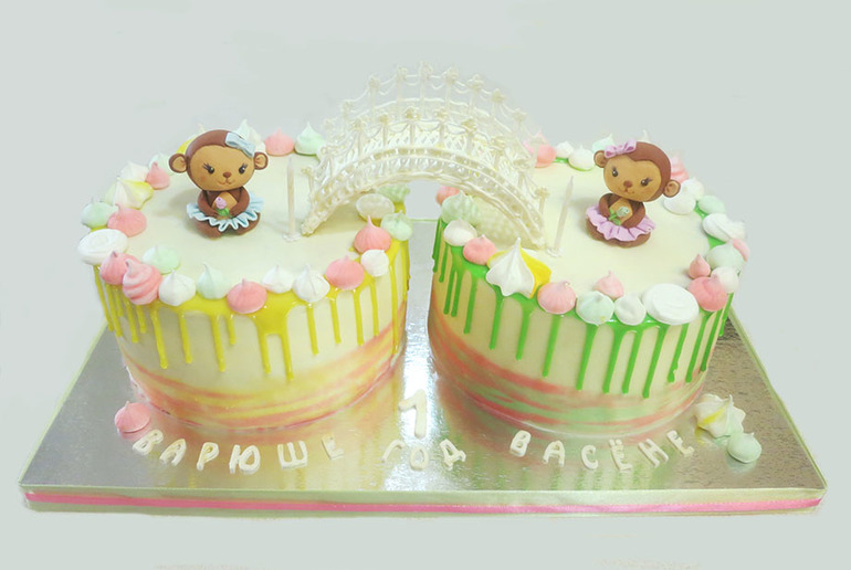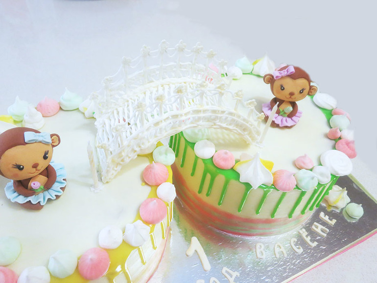 Черный лес и молочная девочка со сливочным кремом, домашней карамелью и грецким орехом, покрытие крем-чиз. Общий вес композиции 4,53кг. Подкат поближе мостик и обезьянки.