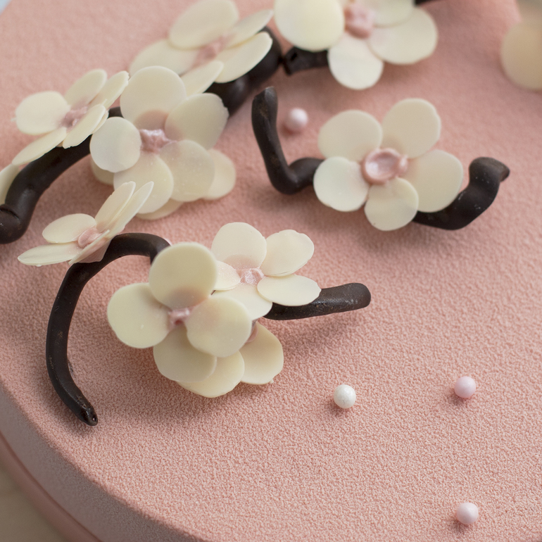 Договорились о нем с девушкой еще за месяц до события, она заказала его на ДР своей мамы. Девушка была сильно в положении. С учетом начинки Груша-Карамель я предложила оформление, стилизованное под цветение груши, оно же и весна на дворе, какая-никакая, да еще и может символизировать обновление, зарождение новой жизни. Тем более что семья действительно в ожидании вот-вот этой самой новой жизни. Декор уже весь готов и я вдруг ловлю себя на мысли, что вижу его розовым, а кого ждут, не знаю. А девочка тем временем пишет, что поехала в роддом, чава-какава, связь с мужем, не поминайте лихом. Окэ. Отправляю этот розовый грушевый торт и через час выясняется, что родилась девочка. И эти несколько часов были очень трогательными. У истории было продолжение. Через пару дней мне звонит эта мама и просит сделать "что-нибудь розовое на завтра, мы забираем девчонок домой". Успела только эклеры розовые, но они пошли на ура )))