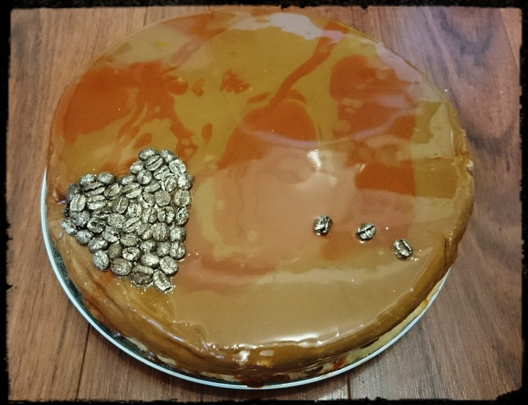 Проба пераВот такой торт вышел. Вкусно, конечно, было очень. Кофейный мусс, кофейная начинка, основа сабле из песочного теста, сверху карамельная зеркальная глазурь, но я поняла, что работать "на коленке" тяжело, надо пойти и купить уже ацетатную плёнку, а то края жуткие.