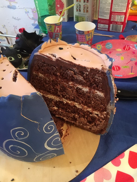 Торты 3ДТортик на 3,8 кг, шоколадный с кремчизом. Сделан по присланному эскизу. Вроде сказали Беззубик, но в мульте он другой. В итоге собирательный образ). Я просто яйцо бы сделала )) и расписала (без дракона). Какое-то оно притягательное было после выравнивания шоколадом и обтягивания мастикой. Ночная съемка на кухне конечно расстраивает, особенно на сложных тортах, ничего не видно и вообще как будто другой торт))) но что уж есть. Подкатом разрез.