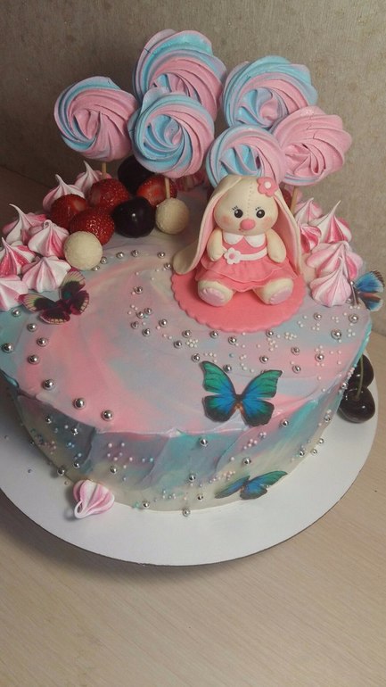 Украшение тортов кремом,шоколадом, фруктамиТакой тортик с зайкой Ми соорудила на 2 годика моей младшенькой принцессе. Начинка -Красный бархат с вишней. Под кат еще фото)
