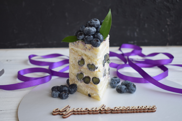 Тортик с воздушным ванильным бисквитом и творожно-сливочным кремом и свежей голубикой, ниже фото в разрезе.