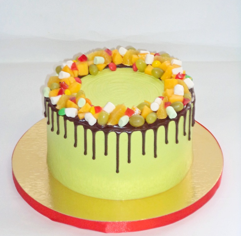 Украшение тортов кремом,шоколадом, фруктамиЧто-то нет у нас никаких ягод поблизости, украсила апельсином, виноградом и нектарином. Творожный крем, творог-масло 3 к 1.