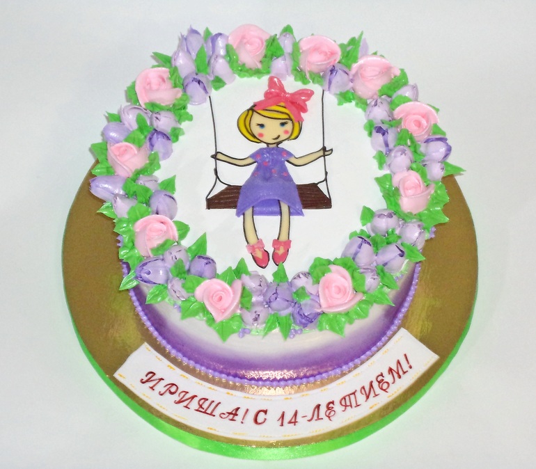 Украшение тортов кремом,шоколадом, фруктамиОформление - белковый заварной, изображение девочки подсмотрела.