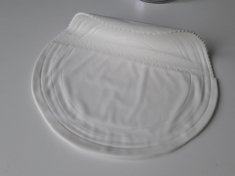 Можно сделать из куска мастики "болванку" нужной формы, замотать ее в пакет, накрахмалить и уложить крышку, пусть сохнет на этой болванке. У вас получится загнутым краем вниз