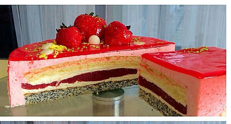 Соберите торт. Затяните кольцо с диаметром больше, чем диаметр торта пищевой пленкой, проложите бортовую ленту. Положите в него торт по центру. По бокам из кондитерского мешка налейте мусс, залейте верх торта муссом. Не забудьте пару раз стукнуть доской, на которой вся эта конструкция стоит, об стол, чтобы мусс ровнее распределился. При необходимости разровняйте сверху мусс ложкой или спатулой. Поставьте в холодильник, чтобы мусс схватился. Или в морозилку. Потом, когда мусс застынет, налейте сверху клубничное желе (не вынимая из кольца). Опять в холод. Потом доставайте. Получится как на картинке. Тут явно не зеркалка, слишком неровно лежит.