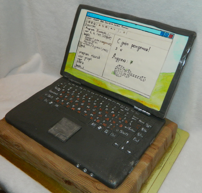 Торты детскиеТорт для будущего программиста (100%)))). Торт находится внутри стола: шоколадный бисквит, мятный шоколадный крем, апельсиновый заварной крем-курд, мусс на белом шоколаде. Вес 3,3 кг. Ноутбук изготовлен из сахарной мастики и конструктивных материалов, крышка открывается и закрывается свободно, как у настоящего). Программа на мониторе - реально написанная в Паскале за минусом некоторых команд для компактности. Вес ноута - 1,9кг.
