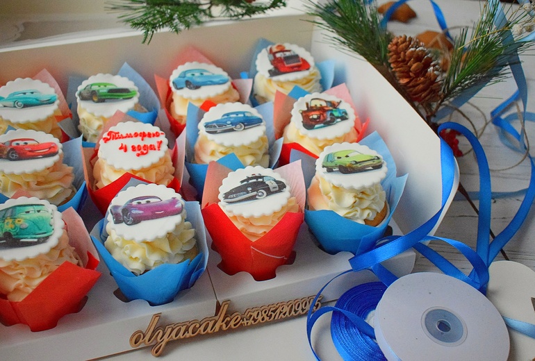 А у меня коробочка вкуснейших ванильных капкейков с начинкой из домашней карамели, с шапочкой сырно-сливочного крема и😋 съедобными картинками из любимого мультфильма именниника "Тачки"! 🚔🚓🚐🚘🚗