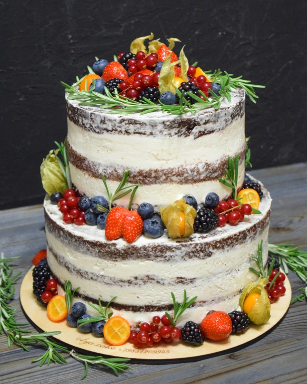 Украшение тортов кремом,шоколадом, фруктами"Голый" свадебный торт с разными свежими ягодками..