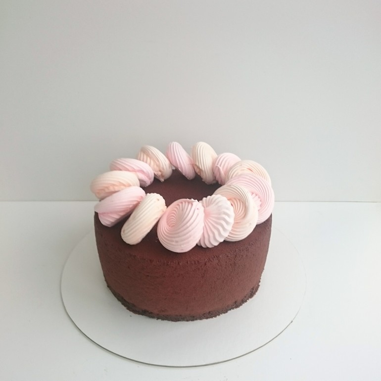 Торт 3 шоколада в нежном оформлении, 2,5 кг, покрытие велюр, украшен безе в нежных розово-персиковых оттенках