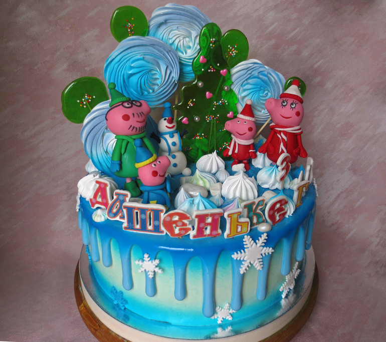 Очень понравился ваш торт! Обычно свинку делают в летнем варианте, а у вас прям зима! Свинки отличные ! Подскажите пожалуйста буквы у вас на сахарной печати? Очень красиво смотрятся. И еще если можно поделитесь пожалуйста (можно в личку) рецептом вашей глазури. Очень красиво она смотрится на торте. У меня все время она льется тонюсенькими линиями. А хочется вот такого эффекта как у вас. Она у вас сверху другого оттенка, темнее чем подтеки, или это мне так кажется? Но смотрится потрясно!