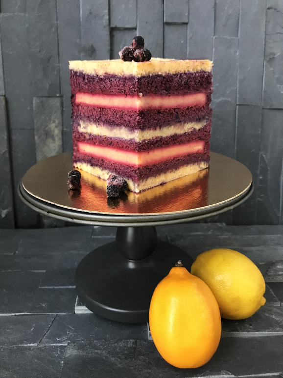 Лимонный бисквит, черничный мусс и лимонный курд в прослойке между слоями мусса.