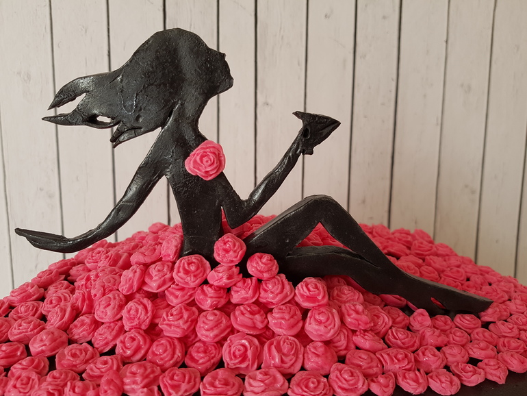 Испекли-собрали, все шло прекрасно. В пятницу (число я как-то и не смотрела. Сначала:)) пришло время торжественного покрытия. Мастику взяли готовую-топ-продукт, чтоб не возиться. Я ее часто беру, никогда проблем не возникало. Правда, черный торт я никогда и не делала. Раскатали. Кладу на торт, только начинаю обтягивать-она начинает безбожно трескаться, не тянется вообще, рвется и ведет себя крайне неприлично! Я снимаю ее, беру другую пачку (хорошо, что был запас)- покрываю опять, меняя толщину раскатки-всё повторяется заново! Тут уже и все выравнивание пошло насмарку... Подруга уже расстраивается! Да и мне уже неудобно-тоже мне, кондитер-самоучка:) Кое-как удалось покрыть так, чтоб хоть один кусочек мастики выглядел прилично. Хотя нет-не прилично, просто без трещин! Остальные куски решено было маскировать розочками. Маскировать пришлось долго! К лепке роз были привлечены даже дети. Использовали, так сказать, труд несовершеннолетних. Роз налепили-почти что миллион:) Короче, вместо короткого платьишка у нашей девицы оказалось пышное роскошное платье со шлейфом:)