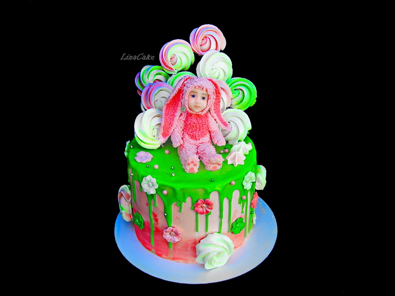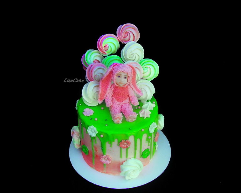 А вот кто наговаривает на тебя, то это ты сама. Детские тоже очень даже классные у тебя тортики. Просто сильно отличающиеся от общего потока. А этот по дизайну(безешки-потёки) слился с общей массой. Точнее, слился бы, если бы не эта мордаха. Бесподобный малыш. Очень реальный на фоне мультяшно-мимишного всего остального