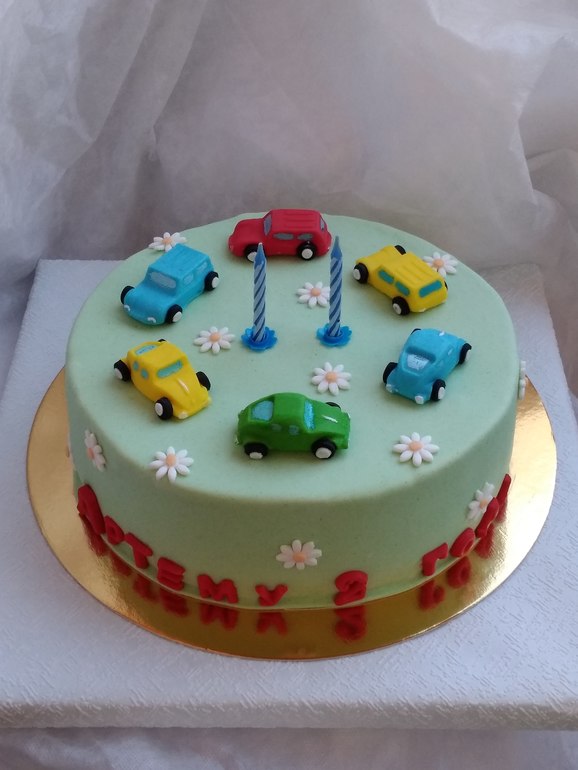 На первый взгляд примитивный небольшой тортик. Но поверьте для маленького ребенка, в два года это очень симпатичный подарок. Размер машинок 2см.
