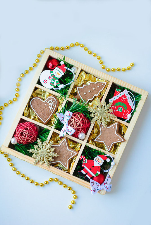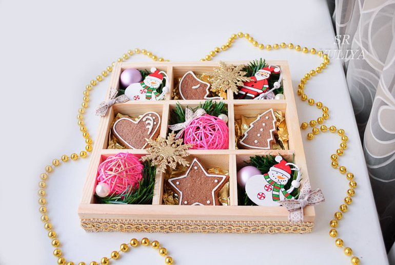 Покажу вам парочку наборчиков, которые сделала по мотивам изысканий в интернете. В составе искусственная ель, шары, подвески, золотые звёзды, ленты, пряники.