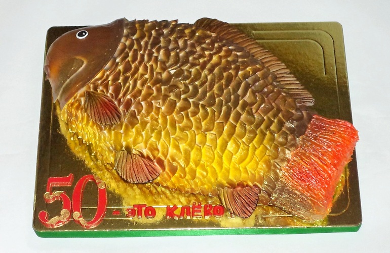 Попросили сделать максимально большую. Но я была ограничена размером подложки, поэтому рыба получилась толстенькая, откормленная. Оформление - белковый заварной.