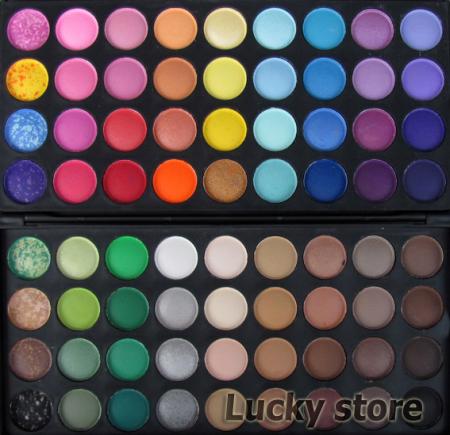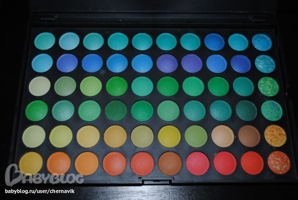 у меня такие же ,только палитра другая( там 50 тенюшек+6 румян). По качеству не скажу , что прямо здорово. Часов через 6 начинают скатываться в складочках века.яркие цвета ,конечно, надо хорошо растушовывать НО пользуюсь только половиной из палитры т.е. зелеными и коричневыми. Такие как :желтые, голубые, фиолетовые, а тем более красные, розовые и оранжевые , так и не наносила.