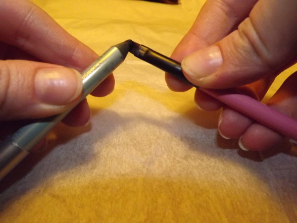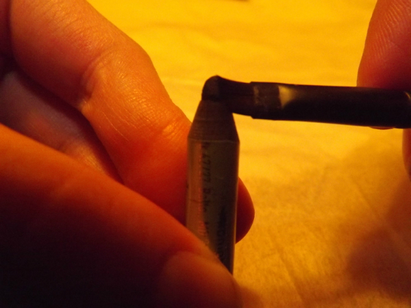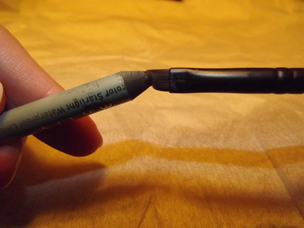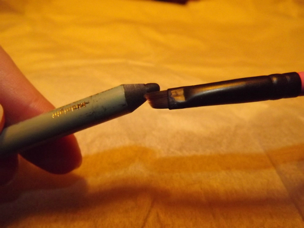 ) кистью по карандашу, чтобы набрать на нее черный, в данном случае, цвет. Я обычно это делаю с правой стороны карандаша, перемещая кисть по стержню полукруговыми движениями, чтобы цвет набрался с обеих сторон кисточки.