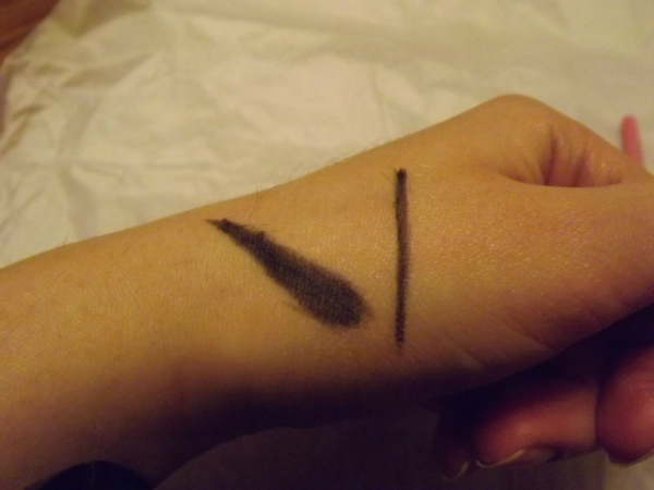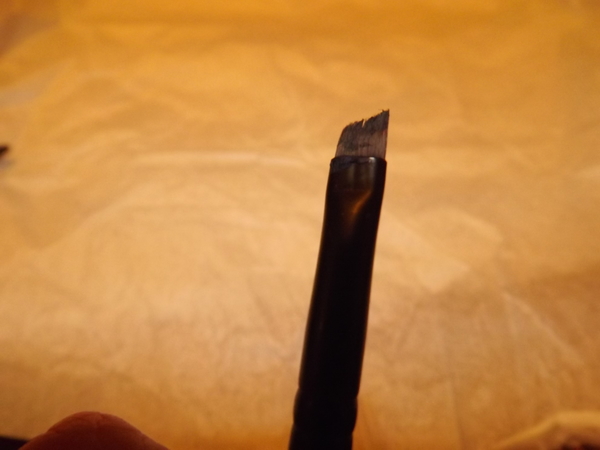 Скошенная кисть, черный карандаш. Карандаш, как видите, не заточен, тк на моих глаз он не касается.