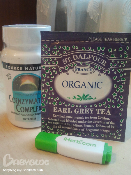 Витамины коэнзим В комплекс, пакетик чая и малюсенький маркер