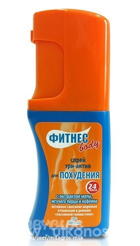Стараюсь каждый день утром наносить "Спрей три-актив Фитнес-body для похудения" (у меня баночка сама желтая, на картинке почему-то синяя, но надписи все совпадают). Стоит около 100-120 р. Консистенция жидкого лосьона, распыляется легко, быстро наносится и хорошо впитывается. Не пачкает одежду. Приятное охлаждающее действие. Наношу его на живот, бока, ягодицы, бедра. Если делаю что-то по дому или идем гулять с детьми - то одеваю пояс