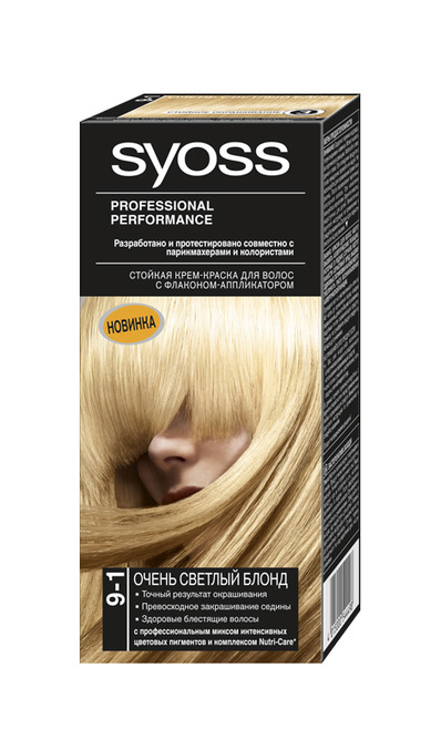 А сегодня, была в магазине и рука моя потянулась сама к краске, хочется чего-то светлого, но не прям блонд, чтобы можно было ходить не парясь когда отростают свой натуральный цвет. В итоге, в магазине я взяла краску Syoss, цвет 9-1 "Очень светлый блонд".