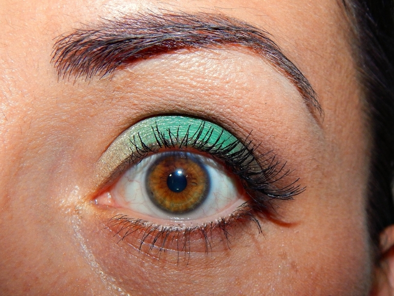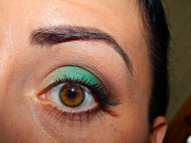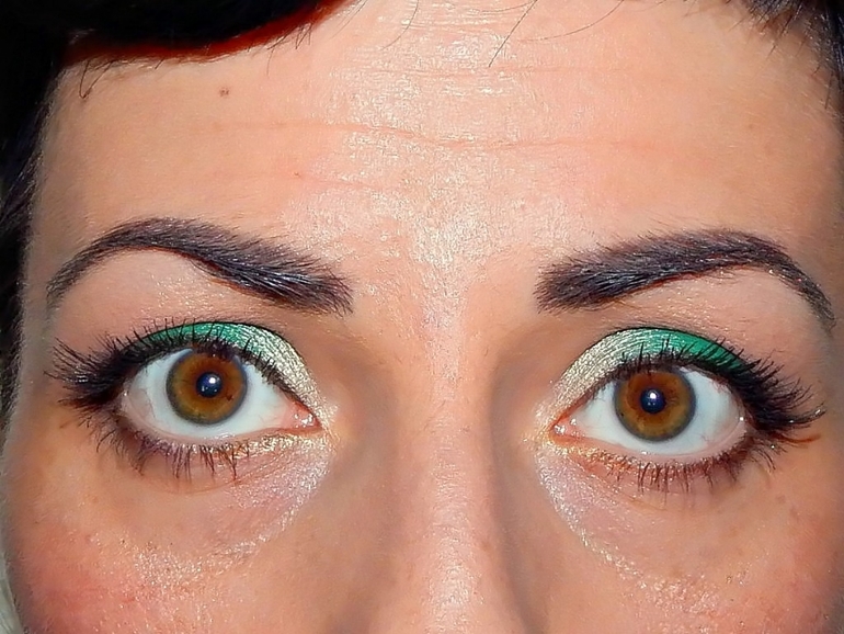 МакияжПодходит для зеленых глаз и карих. Внутренний угол глаза золотые тени, затем изумрудные, внешний угол коричневый тени и растушеваны светло -коричневым. Под бровь пигмент МАС ванила