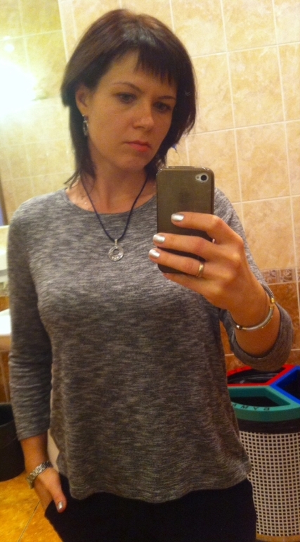Или же сменить черные брюки на зеленую юбку. Я плохо умею выражать картинки из головы в слова, но на мой взгляд такая серая кофта - основа, база. Она должна служить фоном для акцентов. Да и серый сам по себе пасмурный цвет, а в сочетании с ярким цветом он преображается.