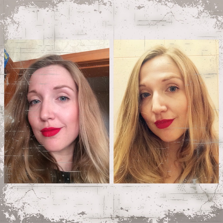 Первое фото-до выхода в свет (поздравление в школе у дочки), второе-после (замученная морда, но губы держались молодцом!)