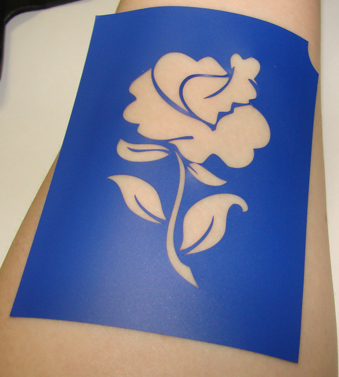 Шаг 1: Приклеиваем трафарет на кожу. Снимаем сначала бумажную подложку и клеим лицевой стороной. Если у трафарета имеются мелкие детали, желательно их отцепить пинцетом. Когда трафарет лег ровно, снимает прозрачную пленку. Следите, чтобы на ней не остались отдельные детали, например, глаз от кошки.